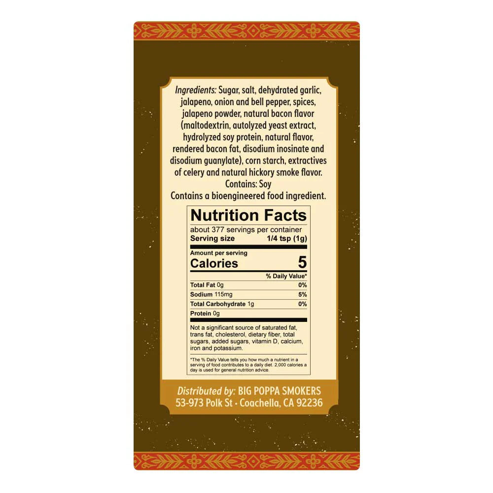 Prepare to awaken your taste buds and embark on a culinary adventure with Big Poppa's Jallelujah Jalapeño Bacon Seasoning – where sweet heat reaches its perfect balance.