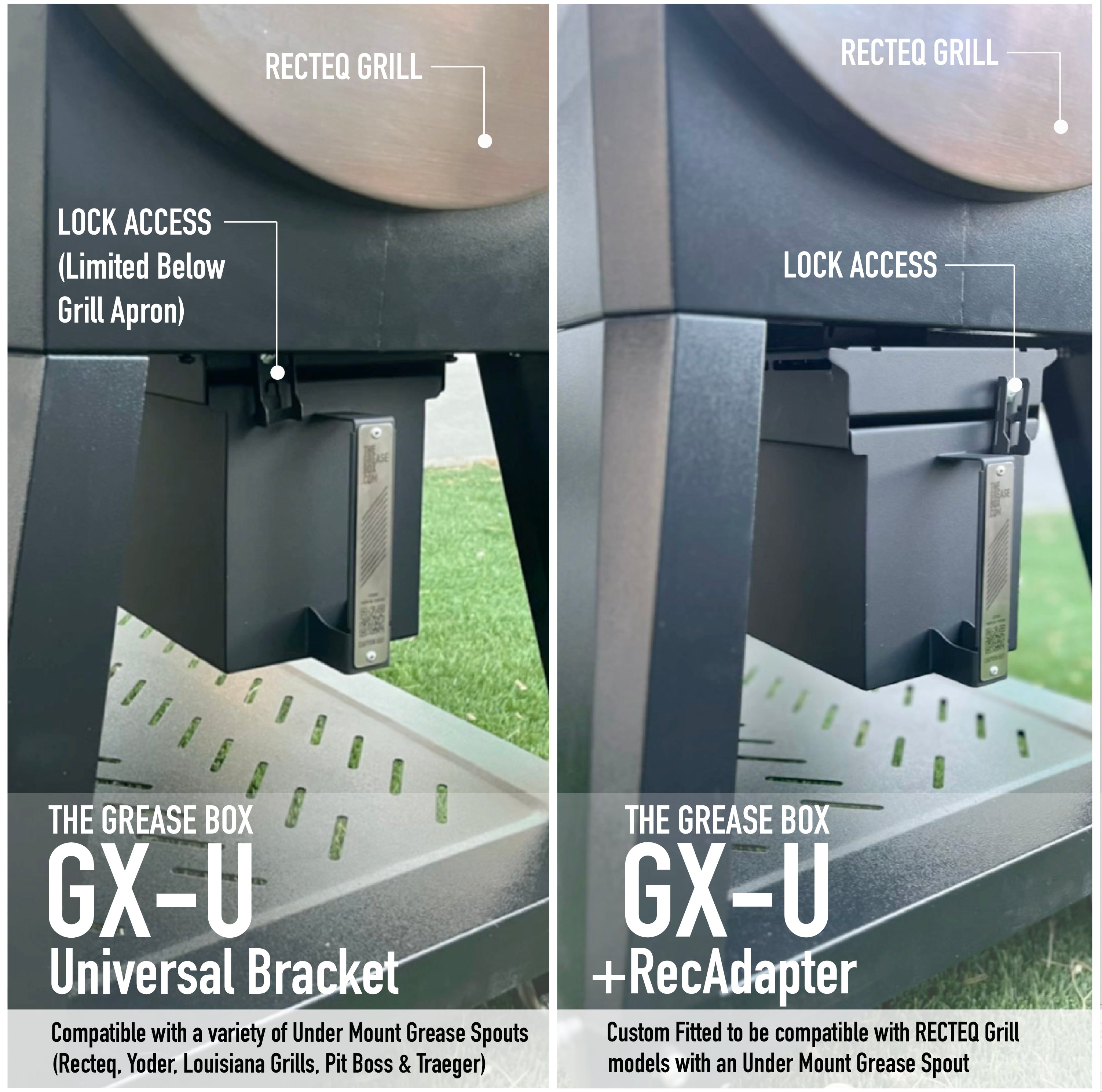 The new GX-U universal bracket design fits a variety of grill models with an under mount grease spout including brands like Yoder, Louisiana Grills, Recteq, Traeger, Pit Boss, & many more. It's designed to fit different variations of grease spouts shapes and locations underneath the grill for both FLAT and ROUND grill bottoms.
