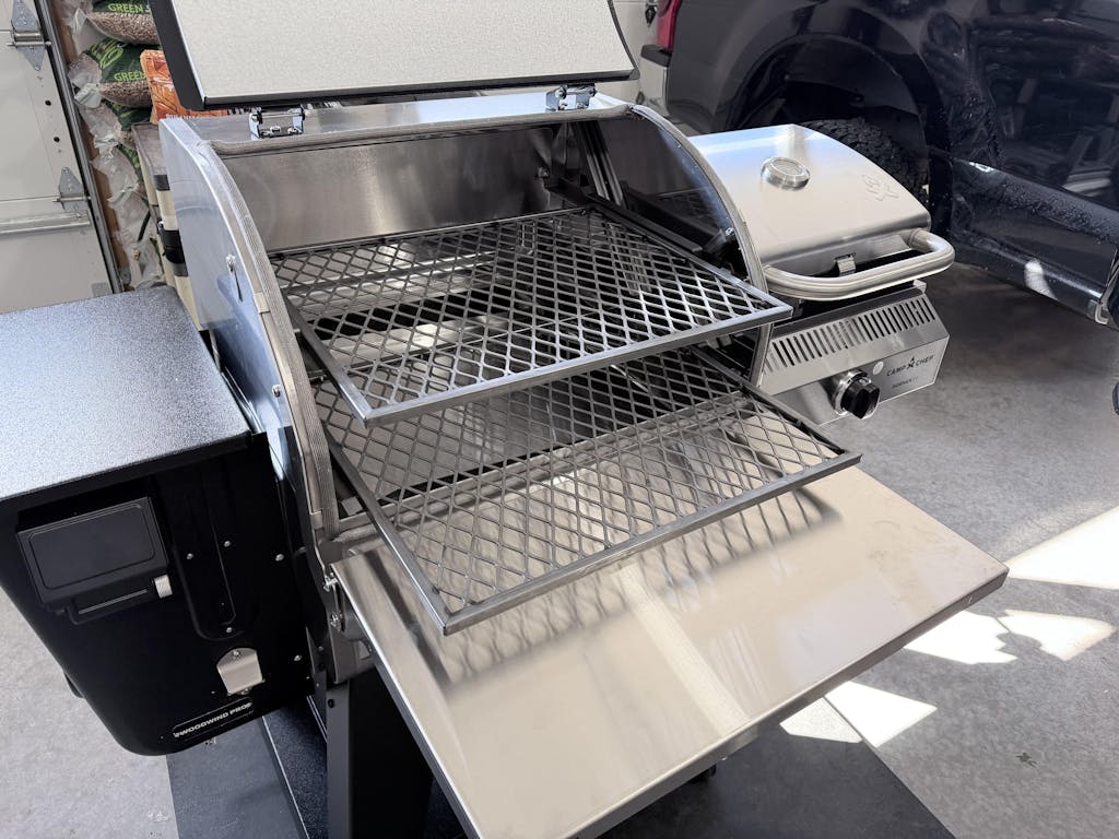 For those of you who are Woodwind Pro 24 owners, this front shelf features a vertical tilt feature so you may access your smoke box with ease.